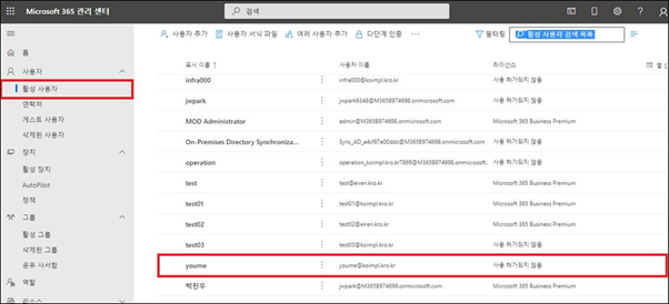 - Microsoft 365 관리 센터의 [활성 사용자] 메뉴에 Exchange On-Premise에서 생성한 공유 사서함이 사용자로 추가가 되어있을 시 동기화 완료