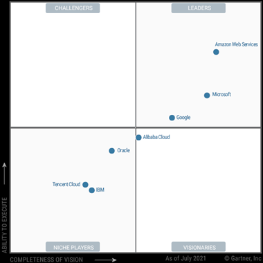 - 실행 부문은 리더와 도전자, 비전은 비저너리와 니치플레이어로 업체들을 구분, 아마존웹서비스(AWS)와 마이크로소프트 애저,
