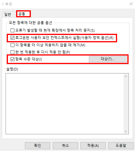 - [로그온한 사용자 보안 컨텍스트에서 실행(사용자 정책 옵션)] 설정