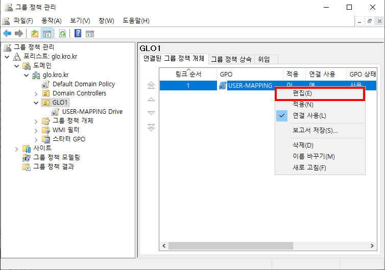 - 생성한 GPO 또는 기존 GPO 선택 > [편집]