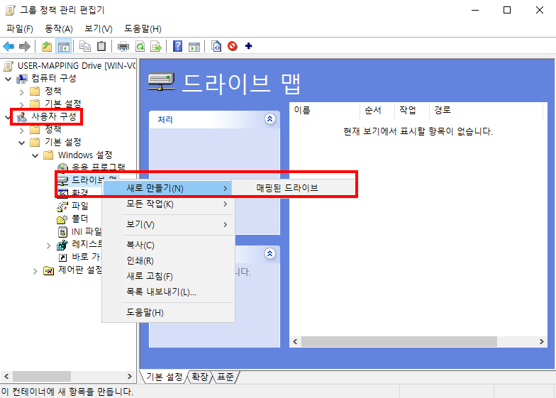 - [사용자 구성] > [기본 설정] > [드라이브 매핑] 선택 > [새로 만들기] > [매핑된 드라이브]
