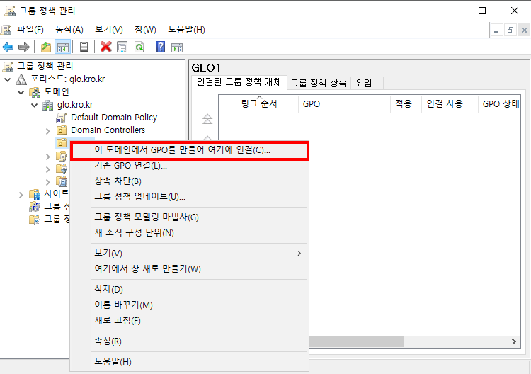- 그룹을 할당 받을 OU 선택 > [이 도메인에서 GPO를 만들어 여기에 연결] 선택