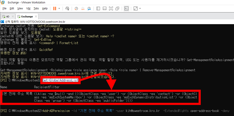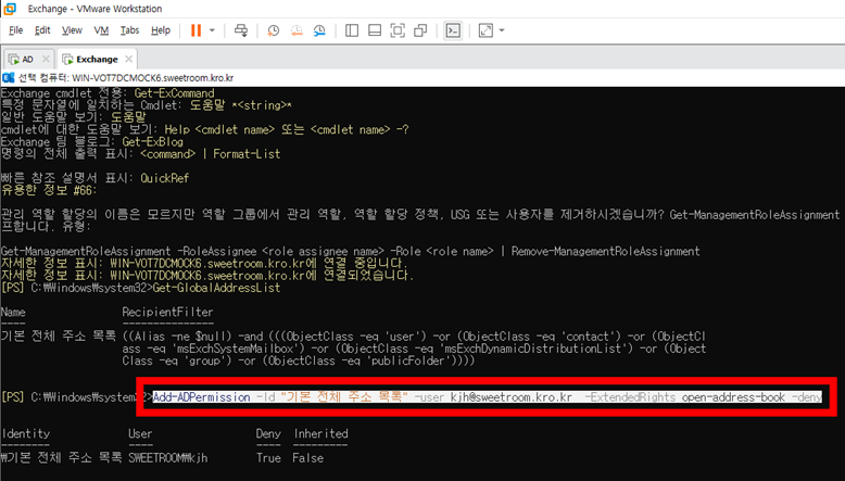 관련 명령어 : Add-ADPermission -Id "기본 전체 주소 목록" -user kjh@sweetroom.kro.kr -ExtendedRights open-address-book -deny