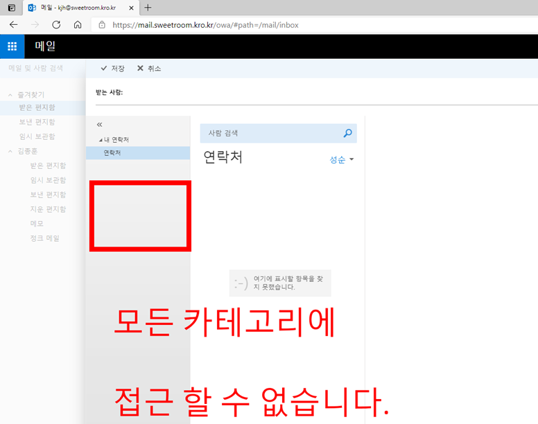 3. 사용자가 브라우저 또는 Outlook Application을 종료 후 재시작하면 아래와 같이 모든 항목을 불러올 수 없는 상태가 됩니다.