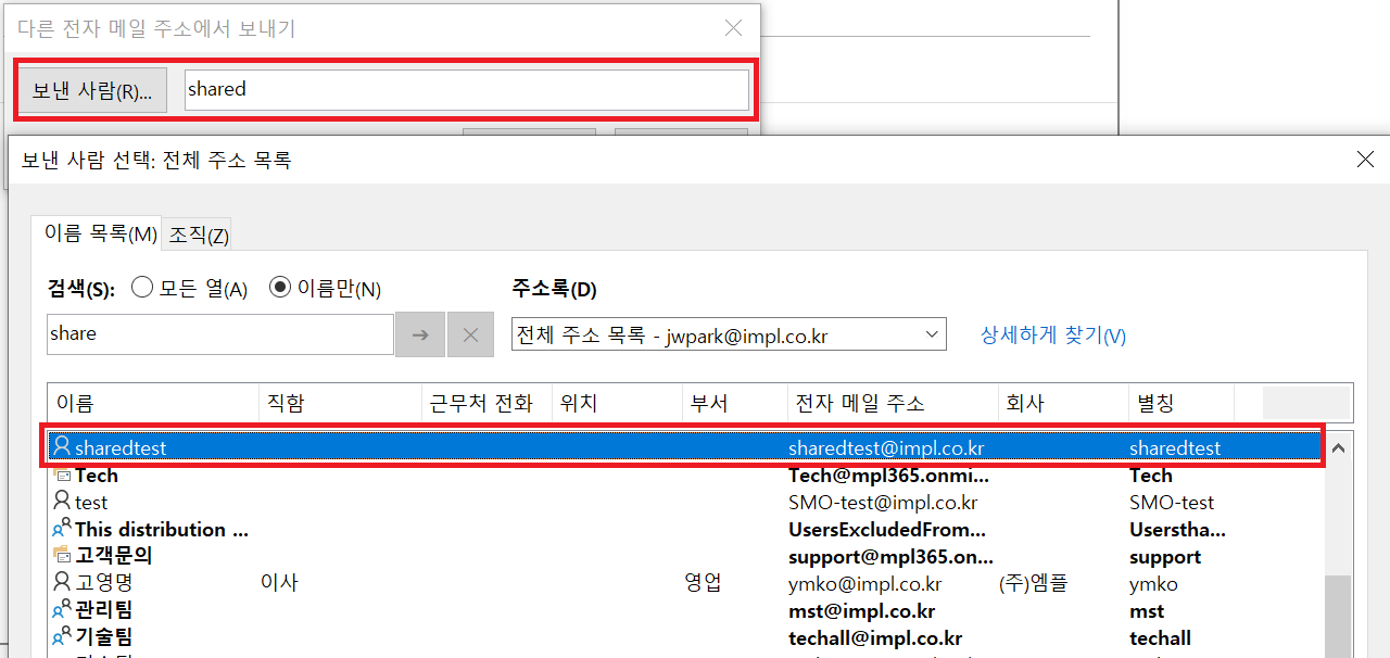 2. 공유 사서함 이름 검색 및 공유 사서함 선택 후 확인