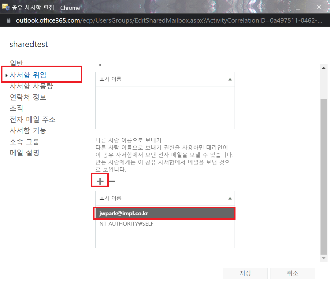 4. [공유 사서함 편집] > [사서함 위임] > [다른 사람 이름으로 보내기] > 사용자 추가 후 저장