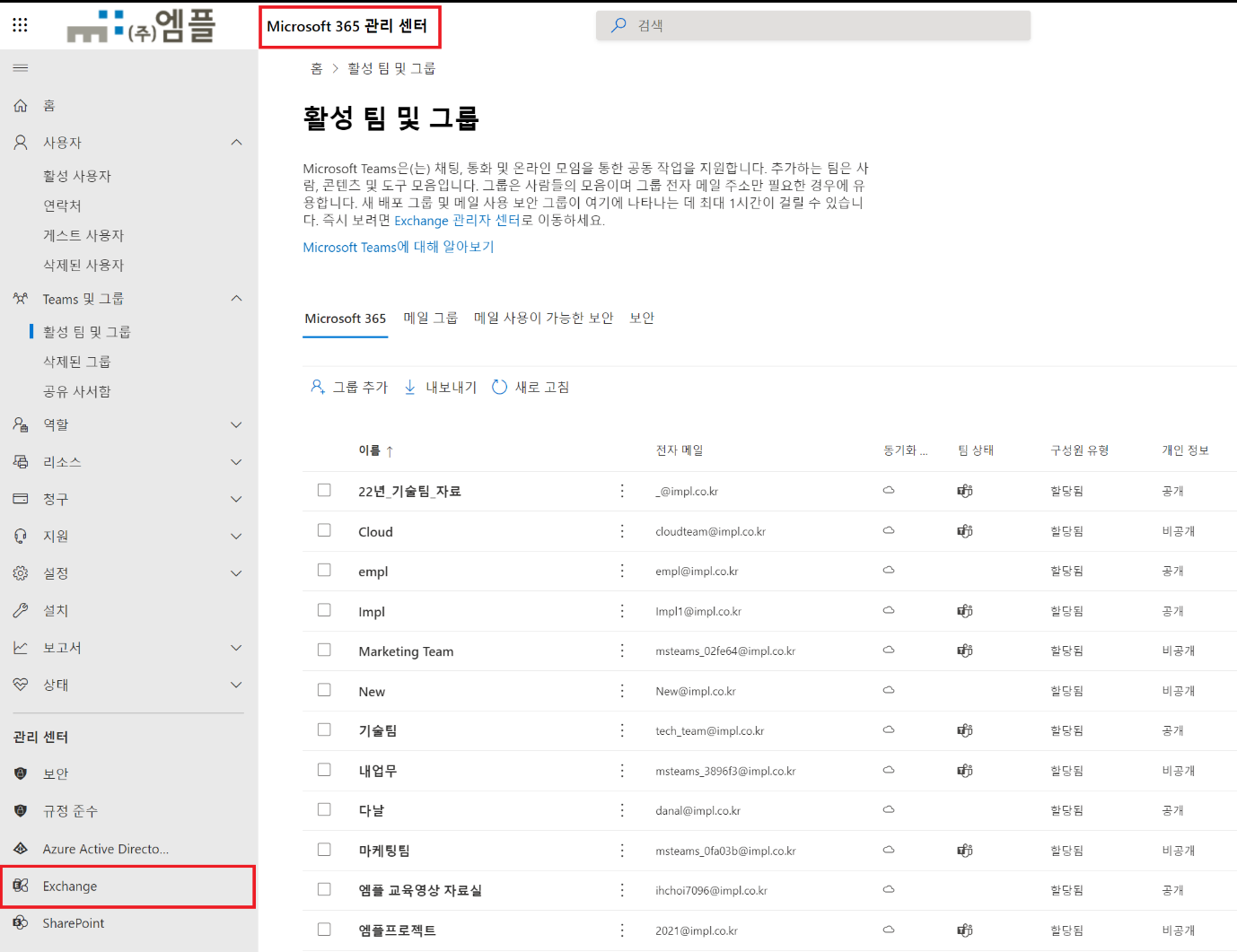 1. [Microsoft 365 관리자 페이지] 접속 > [Exchange 관리센터] 접속
