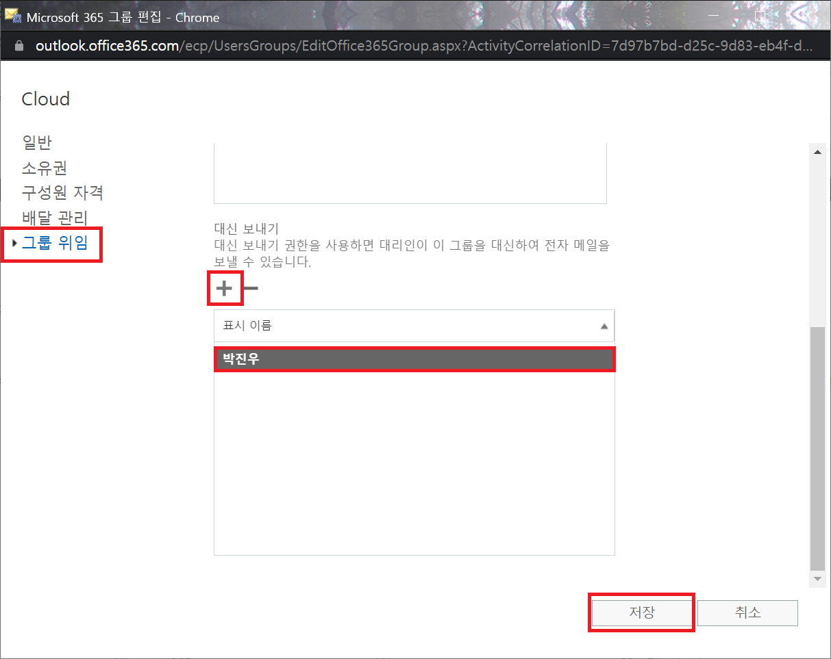 4. [그룹 편집] > [그룹 위임] > 사용자 추가 후 저장