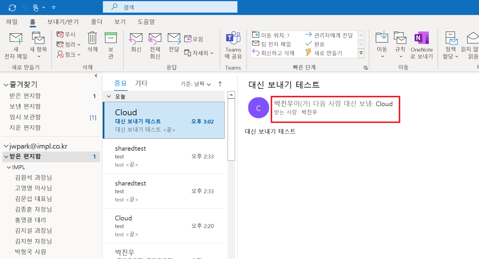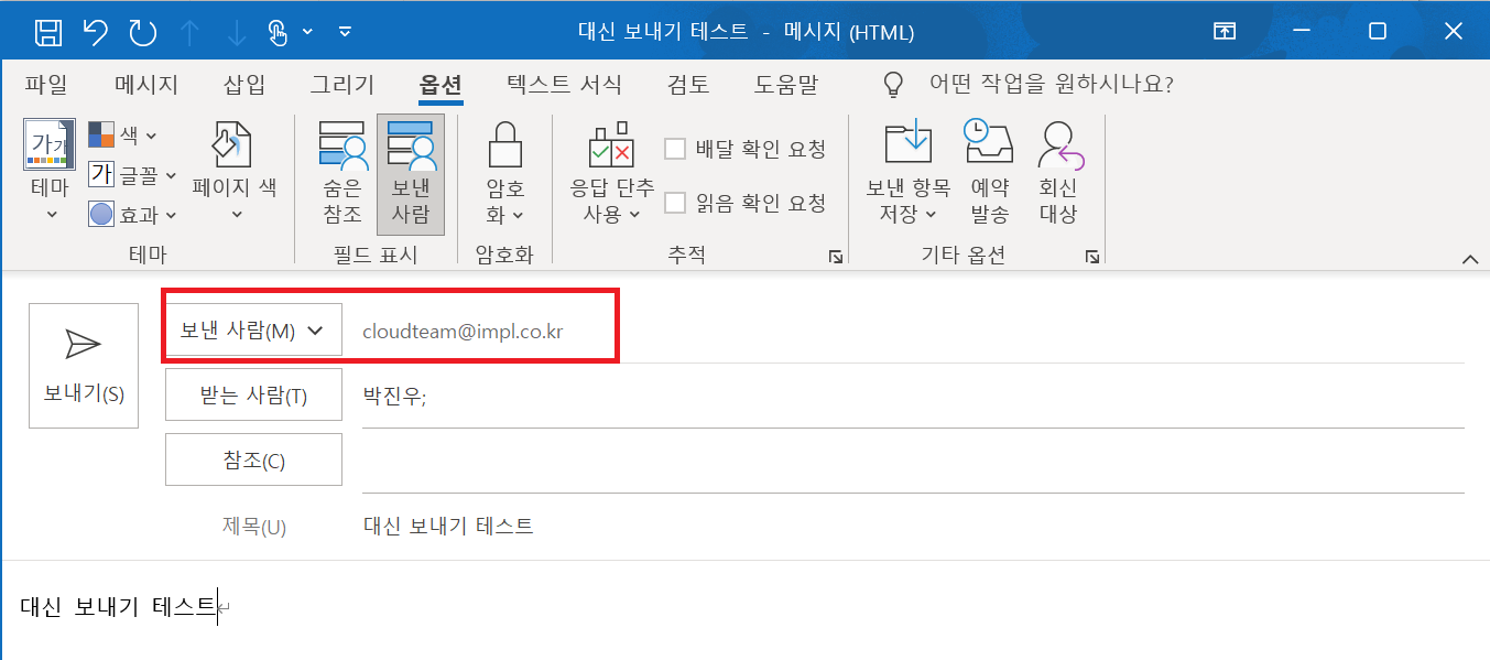 - 메일 수신 시 아래와 같이 누가 대신 보냈는지 표시됨