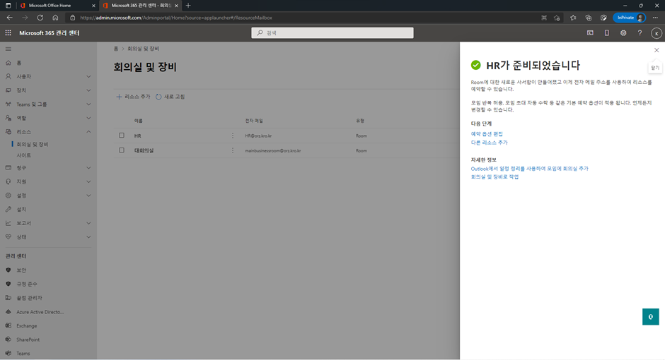 리소스 → 회의실 및 장비 → 리소스 추가 → 관련 정보 입력 → 확인으로 진행합니다.