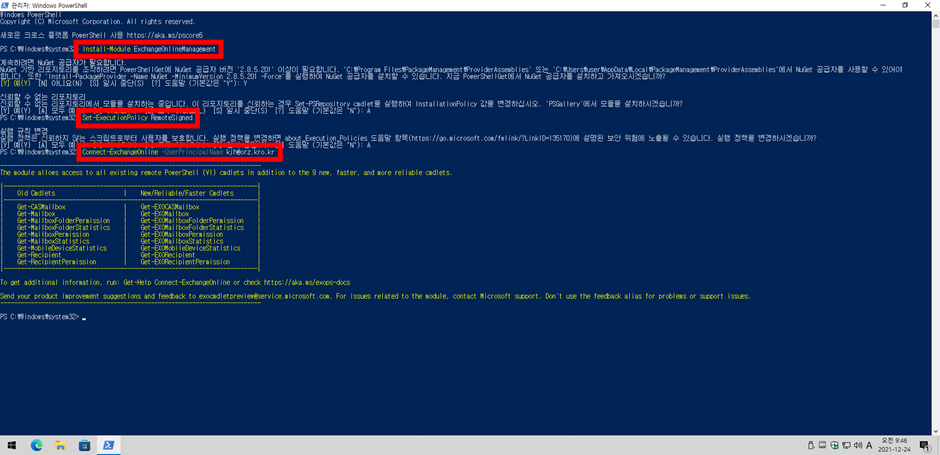 Connect-ExchangeOnline -UserPrincipalName kjh@orz.kro.kr (전역 관리자 계정으로 로그인)
