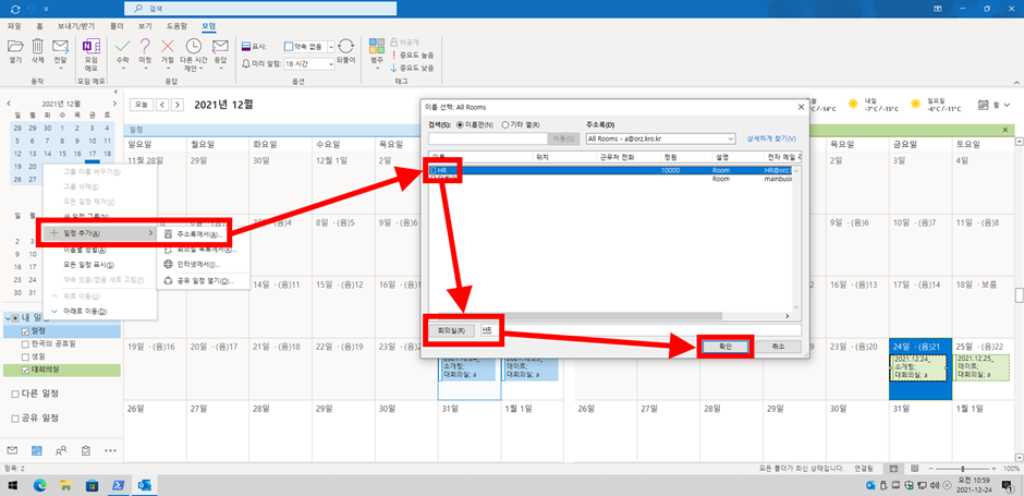 7. Outlook이 실행되면 “일정”에서 “대회의실”을 선택하면, 기존의 일정을 포함한 모든 내용이 다시 정상적으로 표기됩니다.
