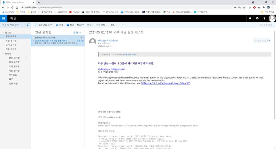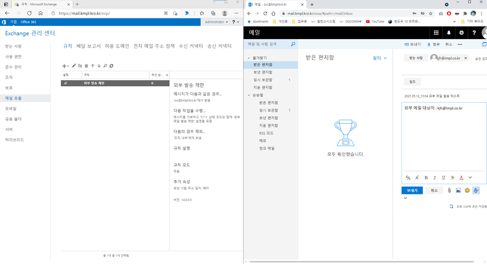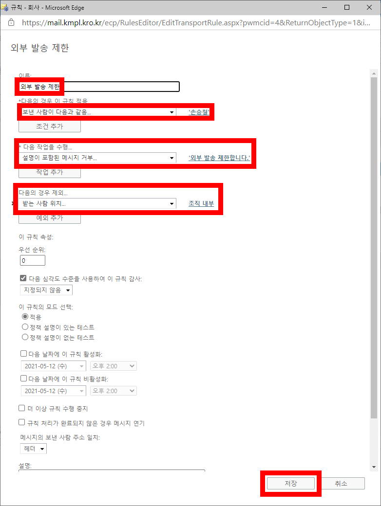 다음 작업을 수행 : "설명이 포함된 메시지 거부" → 외부 발송 제한합니다 선택