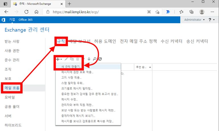 2. 메일 흐름 → 규칙 → + → 새 규칙 만들기를 선택합니다.