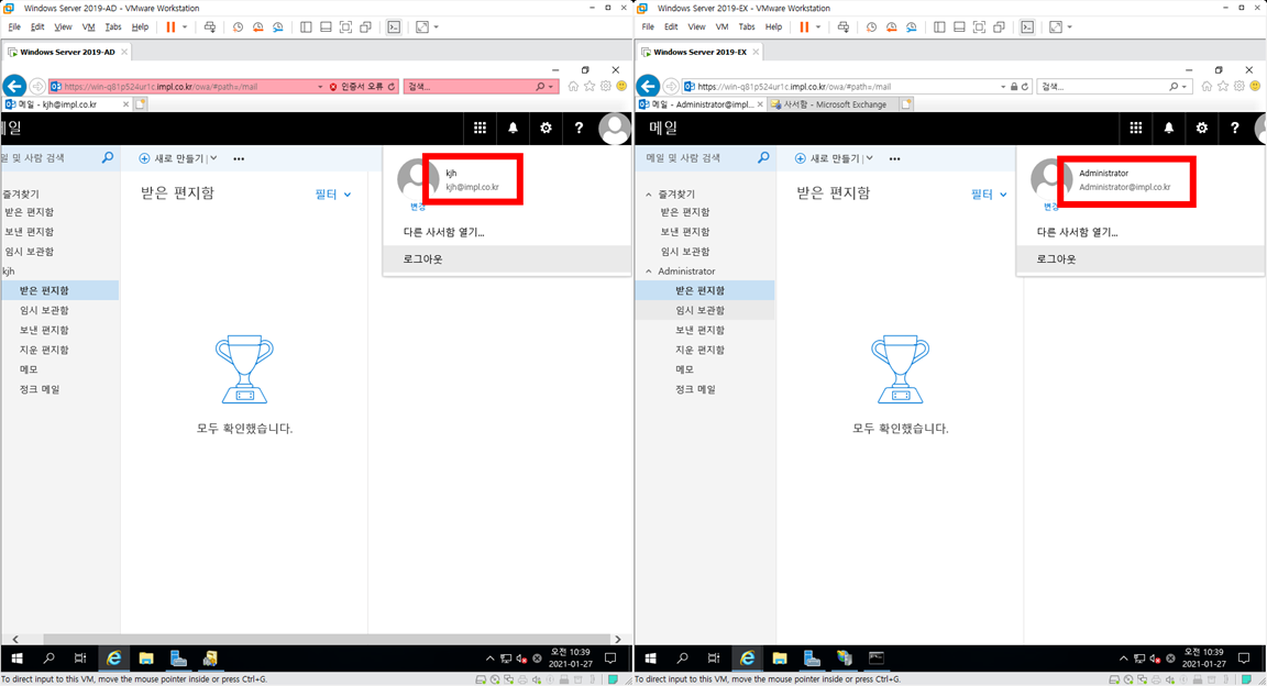 6. Web에 로그인하여 확인하면 모두 impl.co.kr(원래 Active Directory)의 도메인으로 접속할 수 있음을 확인할 수 있습니다.