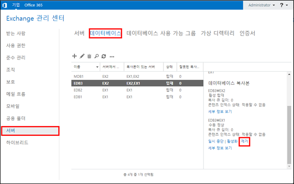 1. Exchange 관리 센터(ecp) 접속 > 서버 > 데이터베이스 > 데이터베이스 복사본 제거