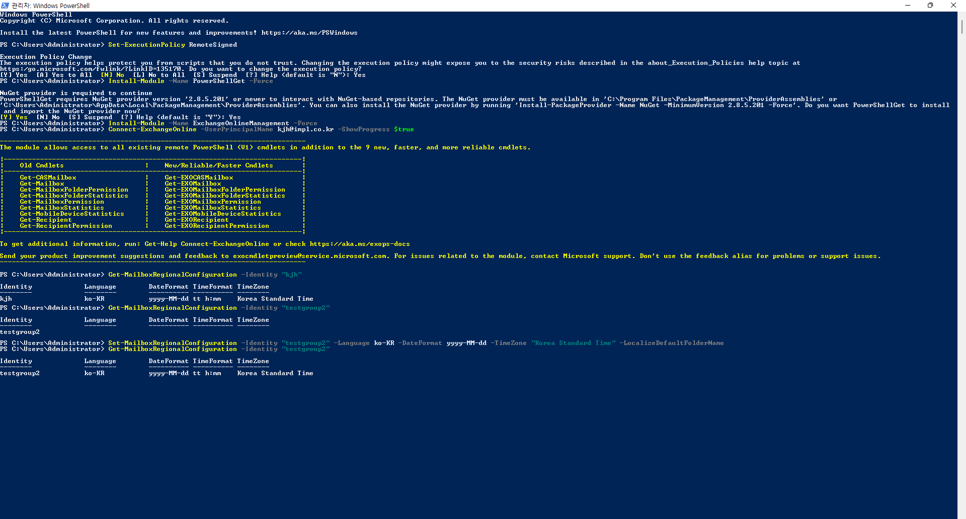 Set-MailboxRegionalConfiguration -Identity " testgroup2(표시 이름 입력)" -Language ko-KR -DateFormat yyyy-MM-dd -TimeZone "Korea Standard Time" -LocalizeDefaultFolderName