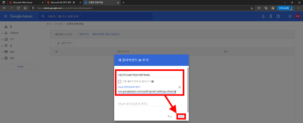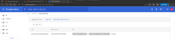 13. 위에 기술된 Client ID와 범위를 admin.google.com에 새로 추가합니다.