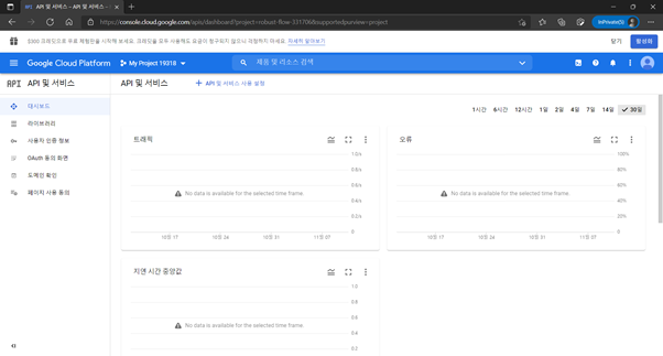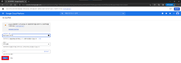 8. 아래의 그림처럼 “Permission iam.serviceAccounts.create is required to perform this operation on project projects/projectid-wzpi.” 메시지가 확인되면 링크를 눌러 google 창으로 이동합니다.