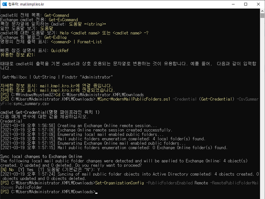 ㄴ. 일정 시간이 지나면 2차 선별 Exchange Online Migration User가 Onpremise PublicFolder 중계 완료 된 것을 확인 할 수 있습니다.