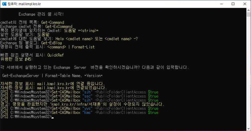 예시 명령어 : Set-CASMailbox "sjh" -PublicFolderClientAccess $true