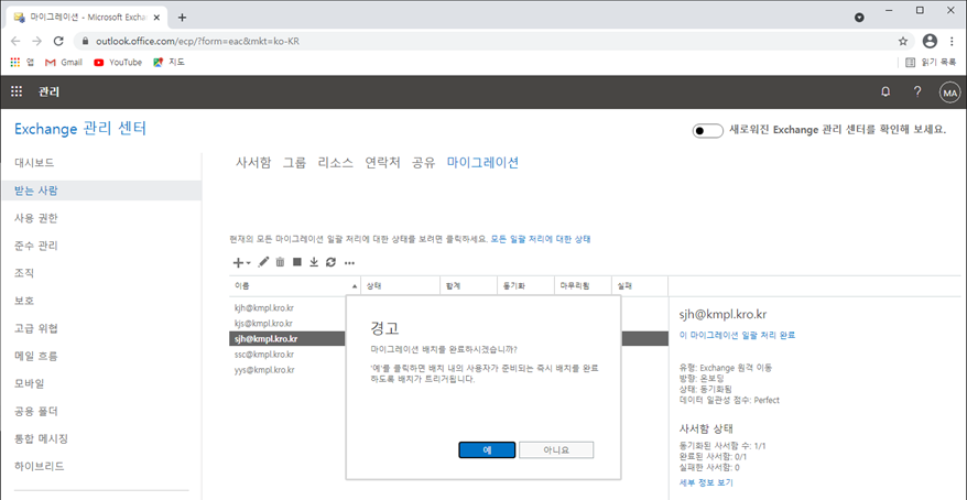 ㄱ. 1차 선별 Exchange Online Migration User complete 진행