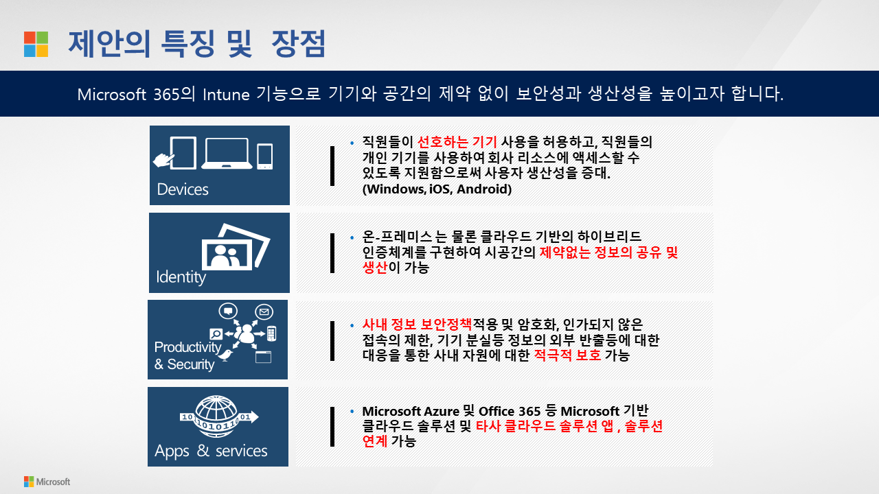 Microsoft 365 [Intune] Microsoft 365 EMS(enterprise mobility + security) 제안서 by (주)엠플 2021. 7. 11. Microsoft 365 EMS(enterprise mobility + security) 제안서.pdf 2.63MB 공유하기 게시글 관리 MPL Cloud Team 저작자표시 비영리 변경금지 (새창열림) 'Microsoft 365' 카테고리의 다른 글 [Intune] AIP_레이블 규칙에 따른 워터마크 적용 방법 (0) 2021.07.21 [Intune] WIP(Windows Information Protection) 및 MAM(모바일 애플리케이션 관리)의 대표 기능 (파일 외부 유출 제어) (0) 2021.07.12 [Intune] MDM(모바일 디바이스 관리) 및 MAM(모바일 애플리케이션 관리)의 대표 기능_⑧어플리케이션 배포 (0) 2021.07.10 [Intune] MDM(모바일 디바이스 관리) 및 MAM(모바일 애플리케이션 관리)의 대표 기능_⑦다른 위치로 복사 기능 제한 (0) 2021.07.09 [Intune] Microsoft 365 Intune의 MDM(모바일 디바이스 관리) 및 MAM(모바일 애플리케이션 관리)의 대표 기능_⑥화면 캡처 사용 불가 방법 기술 (0) 2021.07.08 관련글 [Intune] AIP_레이블 규칙에 따른 워터마크 적용 방법 [Intune] WIP(Windows Information Protection) 및 MAM(모바일 애플리케이션 관리)의 대표 기능 (파일 외부 유출 제어) [Intune] MDM(모바일 디바이스 관리) 및 MAM(모바일 애플리케이션 관리)의 대표 기능_⑧어플리케이션 배포 [Intune] MDM(모바일 디바이스 관리) 및 MAM(모바일 애플리케이션 관리)의 대표 기능_⑦다른 위치로 복사 기능 제한 댓글