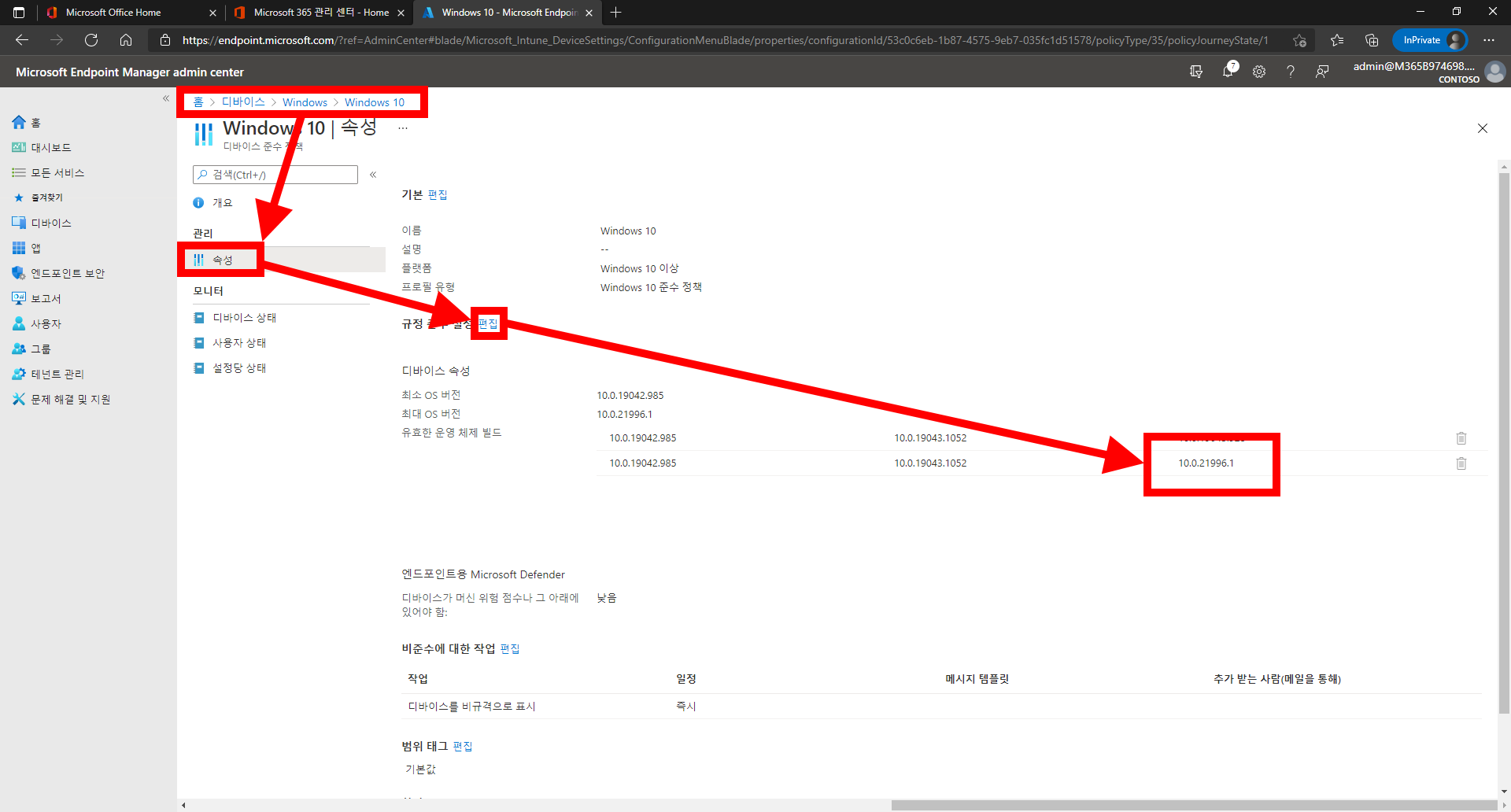 디바이스 → Windows → 준수 정책 → Windows 10(기존에 생성한 Windows 계정 정책 이름) → 속성 → 규정 준수 설정 편집 → 10.0.2xxxx를 설정할 수 있습니다.