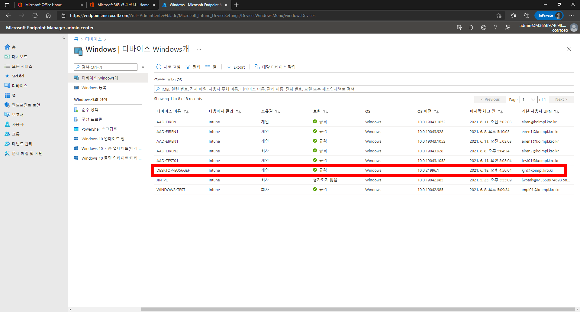 아래의 사진과 같이 Office 365 끝점 관리자 페이지에서