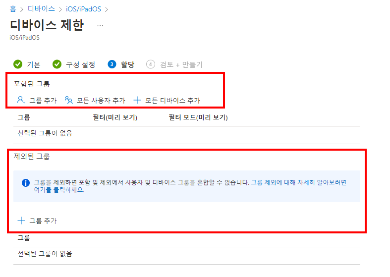 - 구성 프로필을 할당 또는 예외 설정할 그룹을 설정
