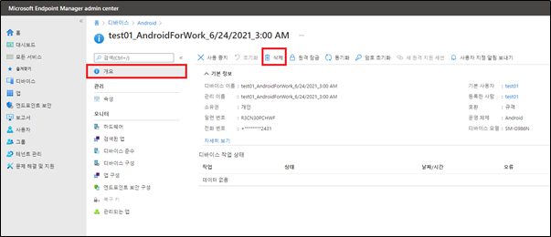 3. MDM Portal 및 회사 앱 제거 할 디바이스 선택 후 [삭제] 실행