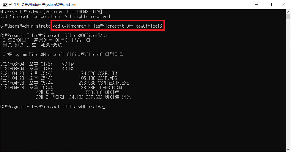 - 명령어 : cd C:\Program Files\Microsoft Office\Office16