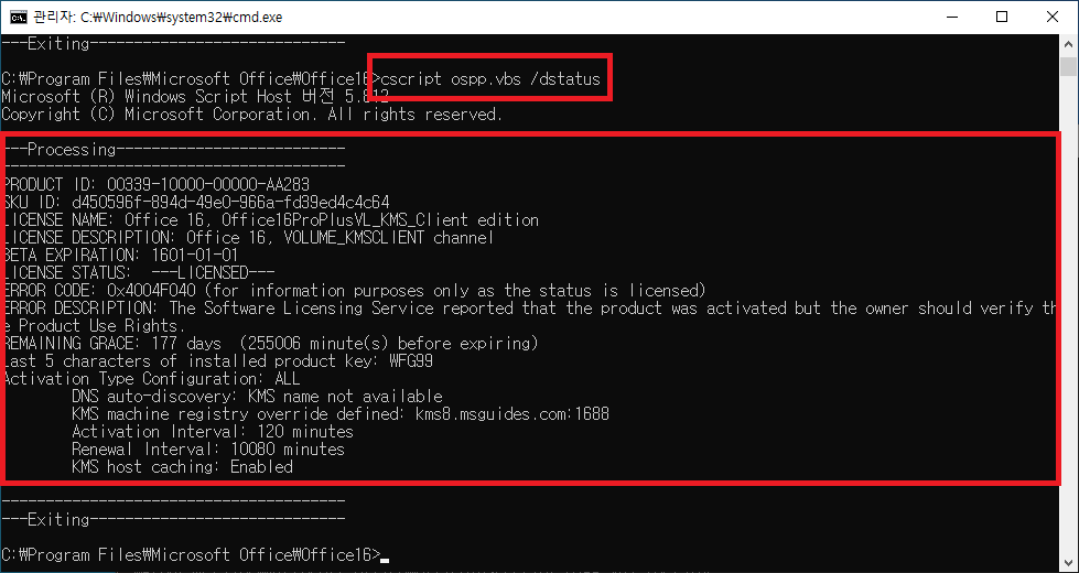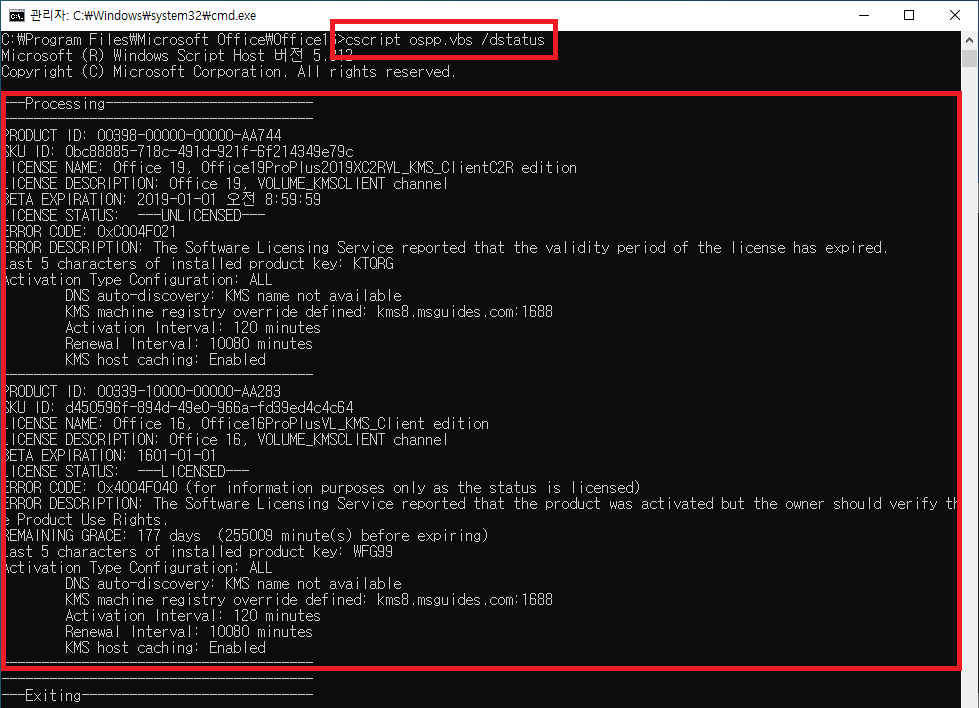 - 명령어 : cscript ospp.vbs /dstatus