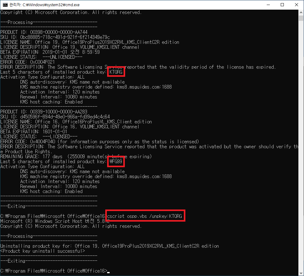 - 명령어 : cscript ospp.vbs /unpkey:[제거 하고자 하는 라이선스 키 입력]