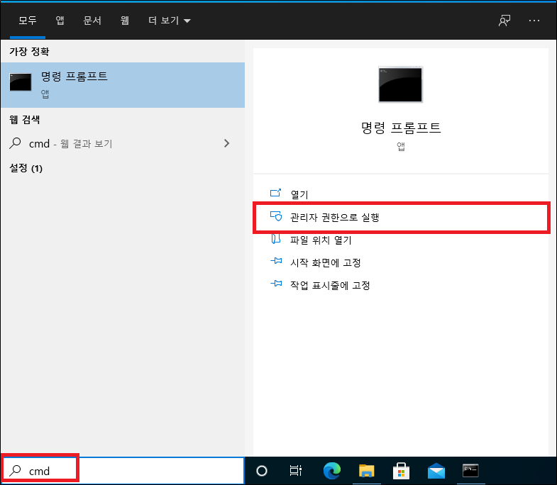 1. 윈도우 검색창에서 CMD 검색 후 [명령 프롬프트]를 [관리자 권한으로 실행]