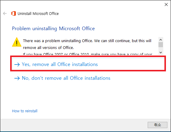 OFFICE 삭제 후 재설치 시 오류 메시지 발생에 대한 조치 방법 기술