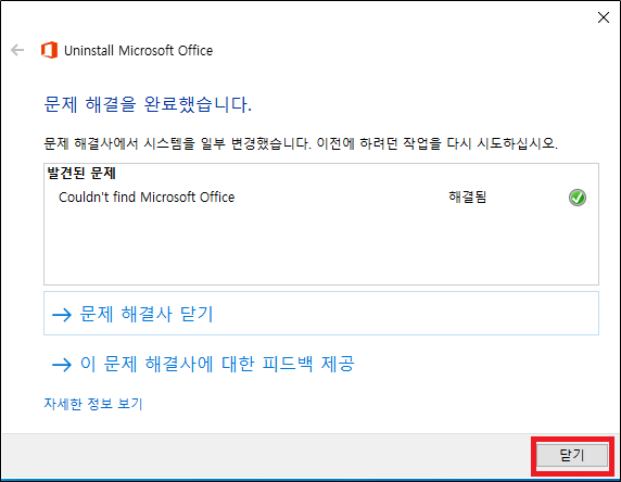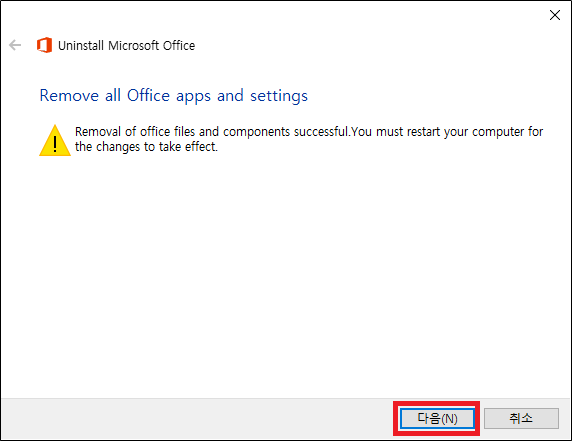 프로그램 추가/제거 실행시 Microsoft Office 프로세스가 완전하게 종료되지 아니하여 삭제 결과 성공 메시지가 출력되나 실제 삭제는 완전하게 이루어지지 않아 발생됨