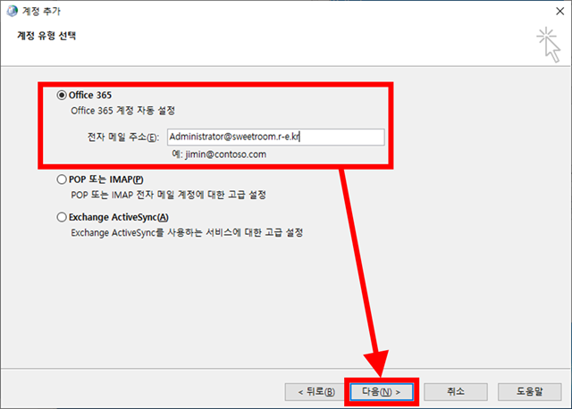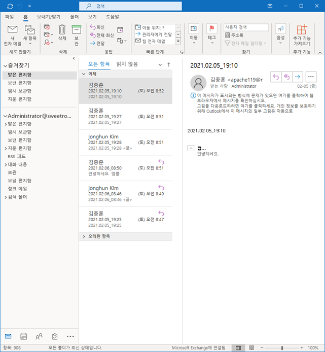 5. Outlook Application으로 exchange on-premises 사용자 메일함 연결 및 동기화