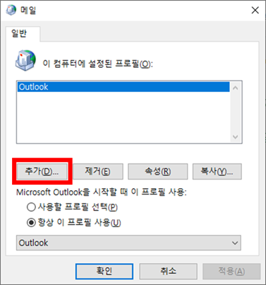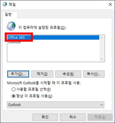 11. Outlook Application 종료 후 Outlook 프로파일 재생성 및 Office 365 Exchange Online으로 사용자 연결