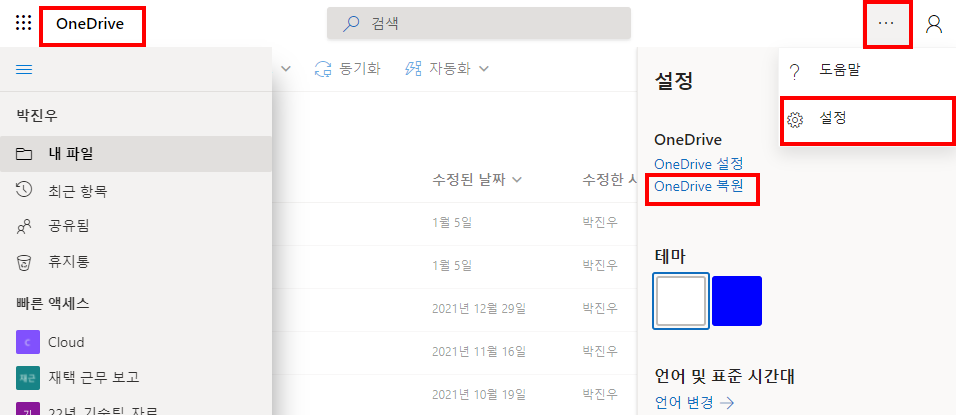 1. [OneDrive] Web 페이지 접속 > [설정] > [OneDrive 복원]
