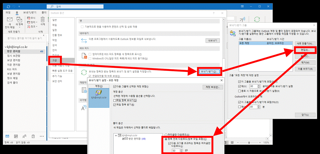 Outlook 옵션 → 고급 → 보내기 받기 항목 선택 → 편집 → 받는 편지함에 대해 일정 데이터 적용