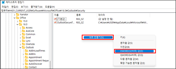 2. 컴퓨터\HKEY_CURRENT_USER\Software\Microsoft\Office\16.0\Outlook\Security 경로로 이동