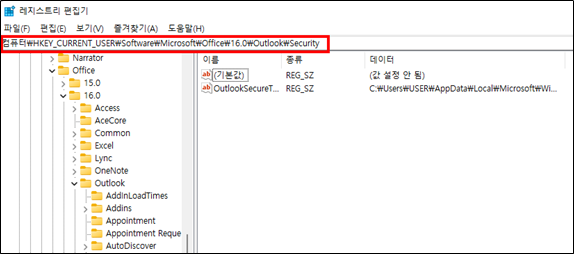 2. 컴퓨터\HKEY_CURRENT_USER\Software\Microsoft\Office\16.0\Outlook\Security 경로로 이동