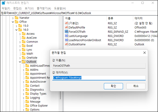 Office365 기준 경로 : 컴퓨터\HKEY_CURRENT_USER\Software\Microsoft\Office\16.0\Outlook