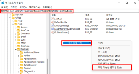 2. Outlook 경로로 이동 후 [확장 가능한 문자열 값]으로 레지스트리 생성