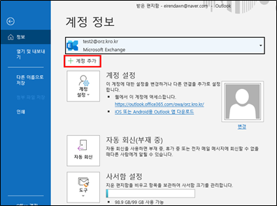 - [파일] > [정보] > [계정 정보] > [계정 추가]