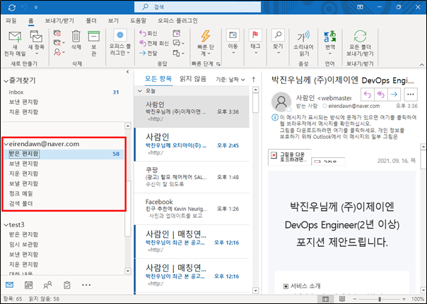 - POP3로 연결된 계정의 경우 기존 보낸 메일에 대해서는 불러오기 불가