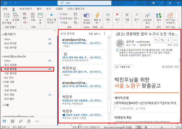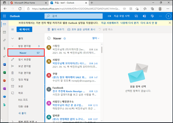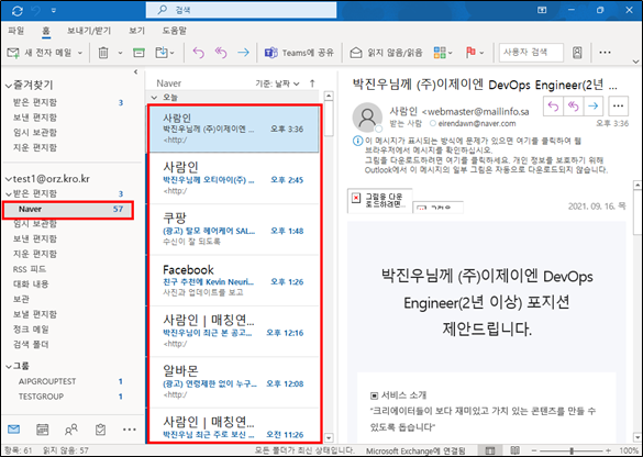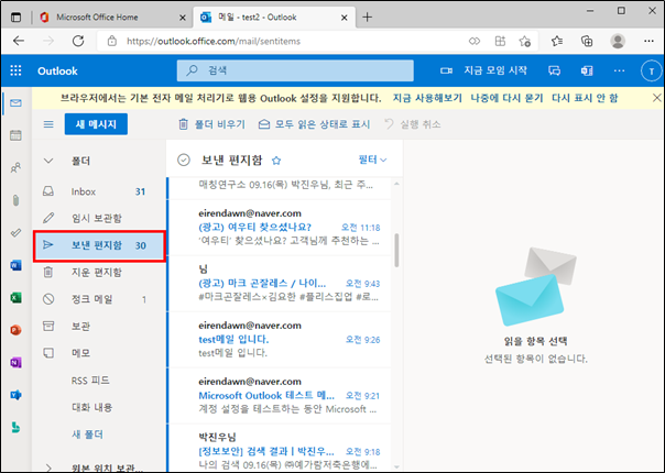 - 메일 이관 확인 (Outlook Application, Outlook Webpage에서 확인 가능)