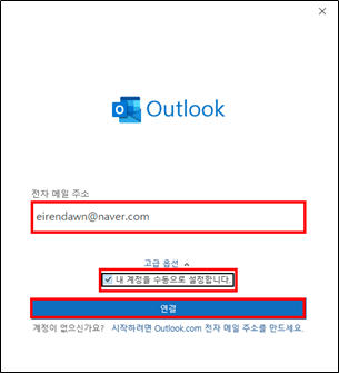 - 메일 주소 입력 및 [내 계정을 수동으로 설정합니다] 옵션 체크 후 연결