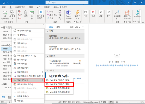 - Office Plugin 설치 후 EML파일을 업로드 할 메일 보관함에 마우스 오른쪽 클릭 > [파일 가져오기] > [EML 파일 가져오기]